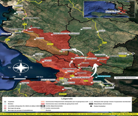 La situation actuelle d'Haïti est une illustration où les principaux quartiers de résistance populaires sont non seulement gangstérisés et les gangs se sont fédérés, circulant librement en toute impunité. Le régime politique de PHTK et alliés dans toutes ses versions jusqu'à aujourd'hui instaure ce que Mbembe appelle le « gouvernement par la terreur ». En effet, la violence ainsi que la terreur des gangs correspondent au mode opératoire et de gestion/contrôle du pouvoir par le régime. De plus en plus de « territoires perdus », c'est-à-dire des territoires pris en otage par des gangs. Et les populations délaissées courent çà et là sans le secours d'aucune autorité gouvernementale : selon l'OIM (2025), « Près de 1,3 million de personnes sont aujourd'hui déplacées à l'intérieur de leur propre pays en Haïti, soit une augmentation de 24 % depuis décembre 2024 […]. Si Port-au-Prince reste l'épicentre de la crise, la violence des gangs s'étend au-delà de la capitale. Des attaques récentes dans les départements du Centre et de l'Artibonite ont forcé des dizaines de milliers d'habitants supplémentaires à fuir, beaucoup d'entre eux vivant désormais dans des conditions précaires et dans des abris de fortune. » Les deux images suivantes représentent une cartographie des gangs respectivement dans la zone métropolitaine de Port-au-Prince et dans l'Artibonite.